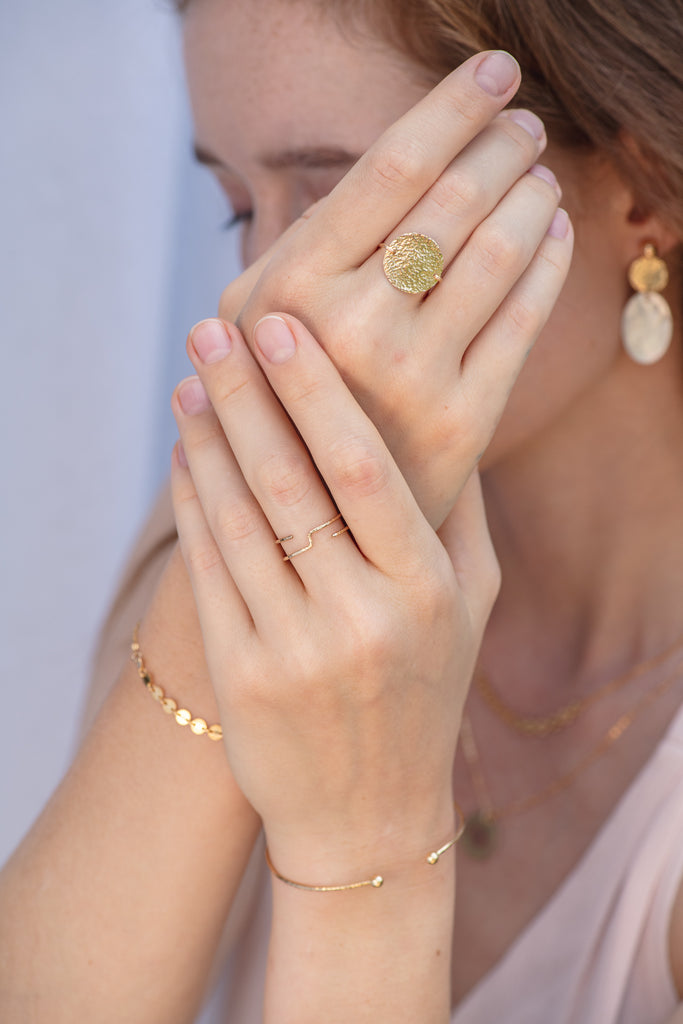 Some of our 14K gold-filled rings may show a tiny area (around 1–1.5mm) with a slightly silvery tone at the bottom. This is completely normal on gold-filled jewellery that has been soldered, as the heat used to join the metal can cause a subtle change in colour at the joint.