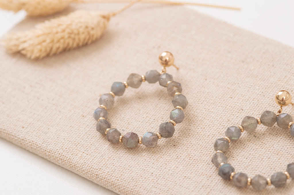 Laissez vous embarquer au Maroc avec nos créoles CASABLANCA composées de pierres Labradorite aux reflets or et vert.