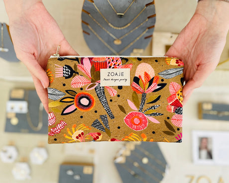 Introducing Zoaje's Limited Edition Makeup pouch : a fusion of artistry and practicality. Adorned with Australian native flowers print that celebrates the beauty of nature, this tote brings a sense of summer charm. Its spacious design, complete with a cotton beige lining and a golden zip, ensures that it's not just a fashion statement but also a functional accessory. Perfect for the woman on the go, it effortlessly accommodates a laptop while adding a touch of global flair to any outfit.