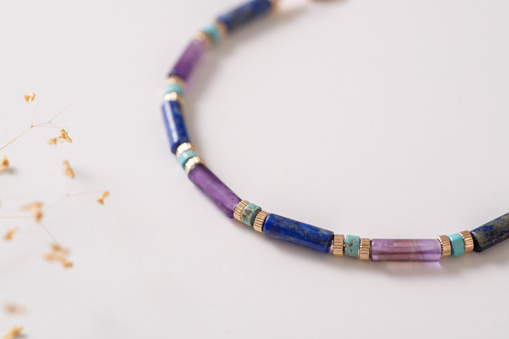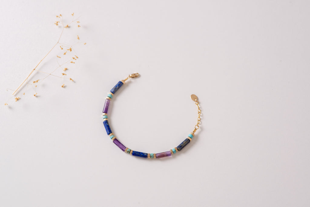 The OLYMPIA bracelet weaves lapis lazuli, turquoise, and amethyst into a rhythmic composition of colors, like the morning light gliding over Mount Olympia — serene yet powerful. Circling the wrist with a quiet, timeless elegance.